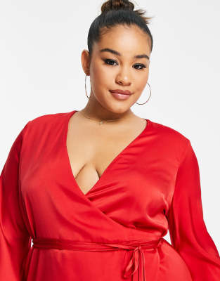 Asos Design Curve Bias Cut Satin Wrap Dress With Tie Waist In Red Asos